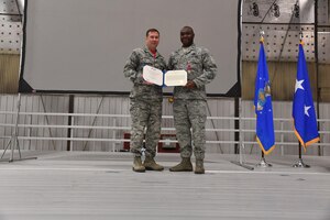 Maj. Gen. Christopher Bence, Air Force Expeditionary Center commander, presents Col. Rodney Lewis, 319th Air Base Wing commander, with the Legion of Merit on Grand Forks Air Force Base, N.D., April 14, 2017. Lewis departed from Grand Forks AFB and is appointed director of the executive action group