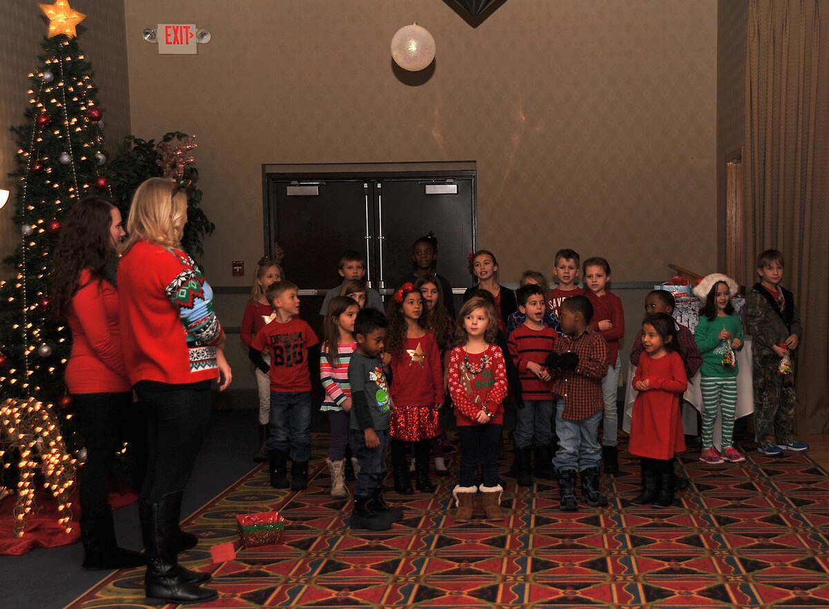 Children sing carols at the Holiday Tree Lighting ceremony in the Northern Lights Club on Grand Forks Air Force Base, North Dakota, Dec. 7, 2015. Additional activities at the event included a visit from Santa Claus, ornament making and free hot chocolate. (U.S. Air Force photo by Senior Airman Bonnie Grantham/released)