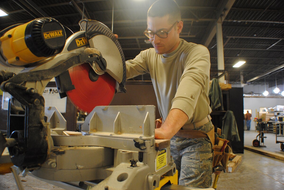 Airman 1st Class Adam Simmers of the 319th Civil Engineer Squadron cuts through a 1x4-inch piece of wood during a construction project for new offices being built on Grand Forks Air Force Base, N.D., Feb. 22, 2012. Simmers has worked on more than 50 different projects since arriving to base eight months ago. Simmers was selected as the Warrior of Week for Grand Forks AFB for the week covering Feb. 19 to 24. (U.S. Air Force photo/Senior Airman Luis Loza Gutierrez)