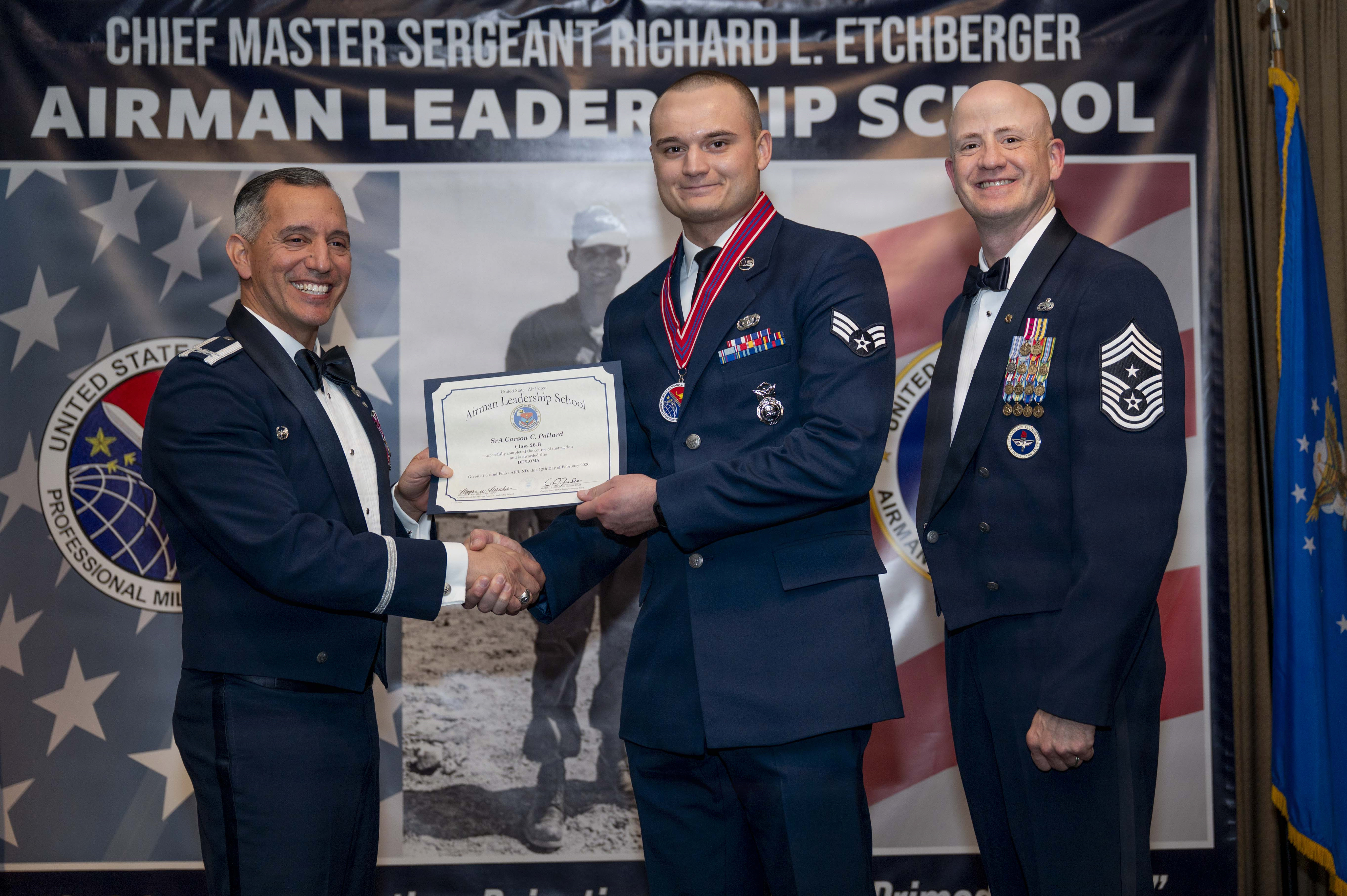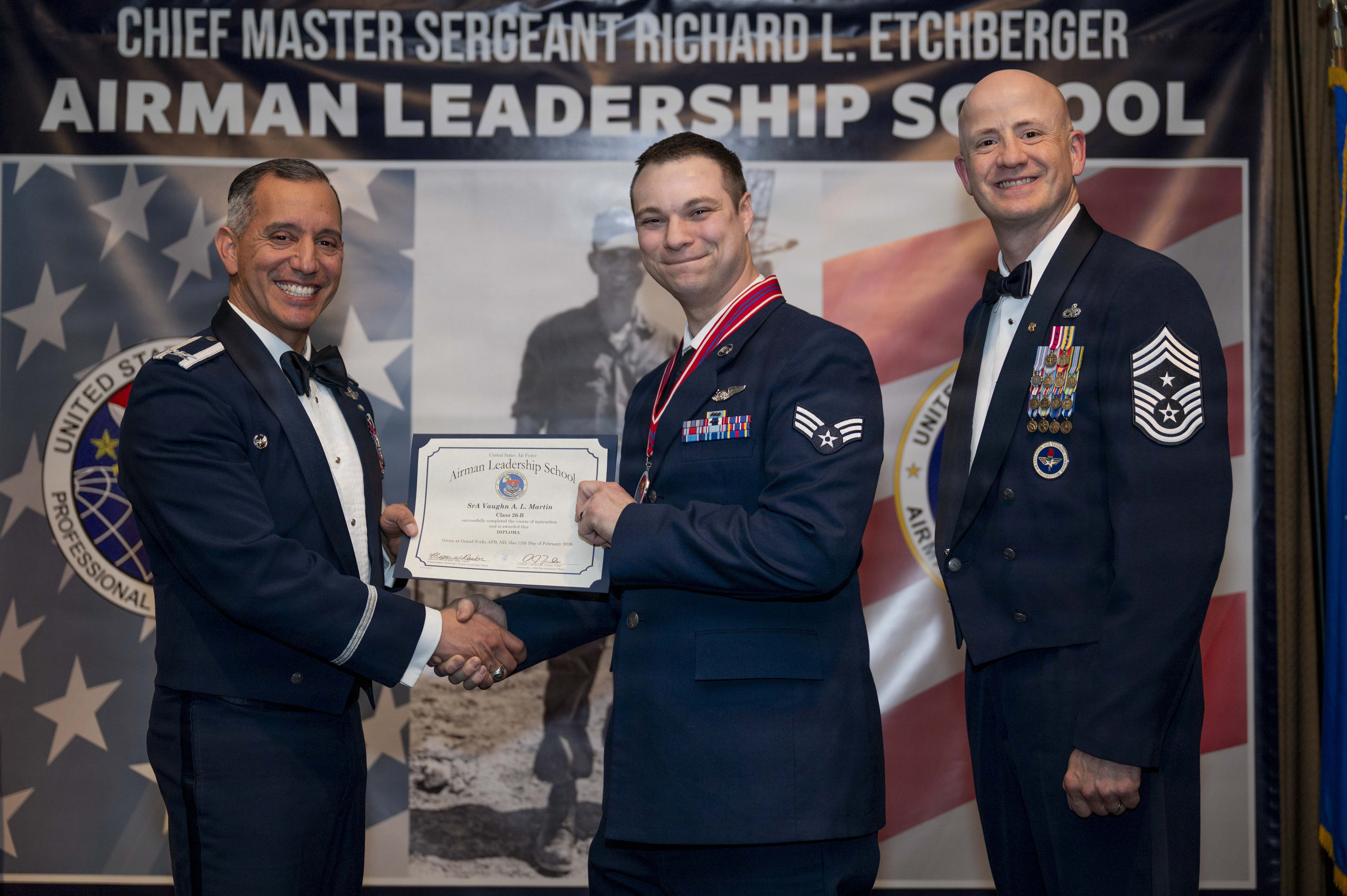 Col. Alfred Rosales, 319th Reconnaissance Wing commander, and Chief Master Sgt. William Gruenes, 319th RW command chief, presents Staff Sergeant Daniel Gasperich with an Airman Leadership School graduation certificate at Grand Forks Air Force Base, N.D., Feb. 12, 2026. (U.S. Air Force photo by Senior Airman Trevor Gordnier)