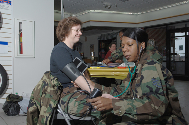 Col. Diane Hull, 319th Air Refueling Wing commander, has her blood pressure taken by Staff Sgt. Telicia Deberry, 319th Medical Group, during the Health Fair at the Base Exchange Feb. 24. The health fair provided information to the base community in honor of Black History Month. More than 100 people participated. (U.S. Air Force photo/Staff Sgt. Suellyn Nuckolls)