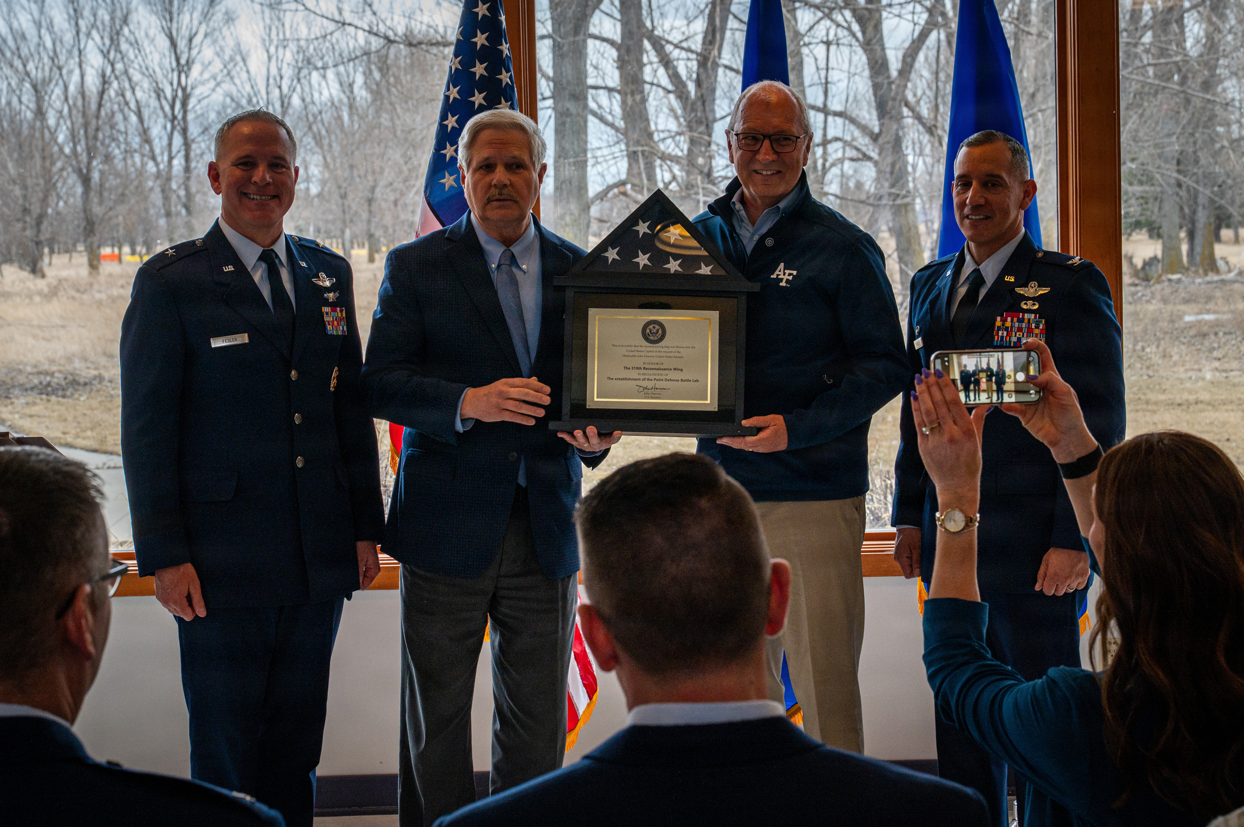 From left, Brig. Gen. Micah Fesler, Air National Guard advisor to the commander, Air Combat Command; Sen. John Hoeven, R-N.D.; Sen. Kevin Cramer, R-N.D. and Col. Alfred Rosales, 319th Reconnaissance Wing commander; pose for a photo during a Point Defense Battle Lab ribbon cutting ceremony at Grand Forks Air Force Base, North Dakota, April 9, 2026. Hoeven and Cramer attended the ceremony to celebrate the PDBL’s accomplishments since its inception in October of 2025. (U.S. Air Force photo by Airman 1st Class Emma Teel)