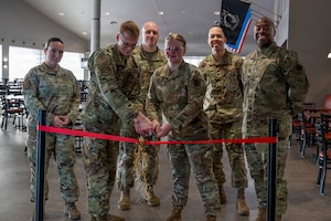 319th Force Support Squadron members cut the ribbon, officially opening the newly renovated Airey Dining Facility dining room at Grand Forks Air Force Base, North Dakota, Feb. 9, 2026. The ceremony marked the completion of months of planning and coordination between the 319th Force Support Squadron,